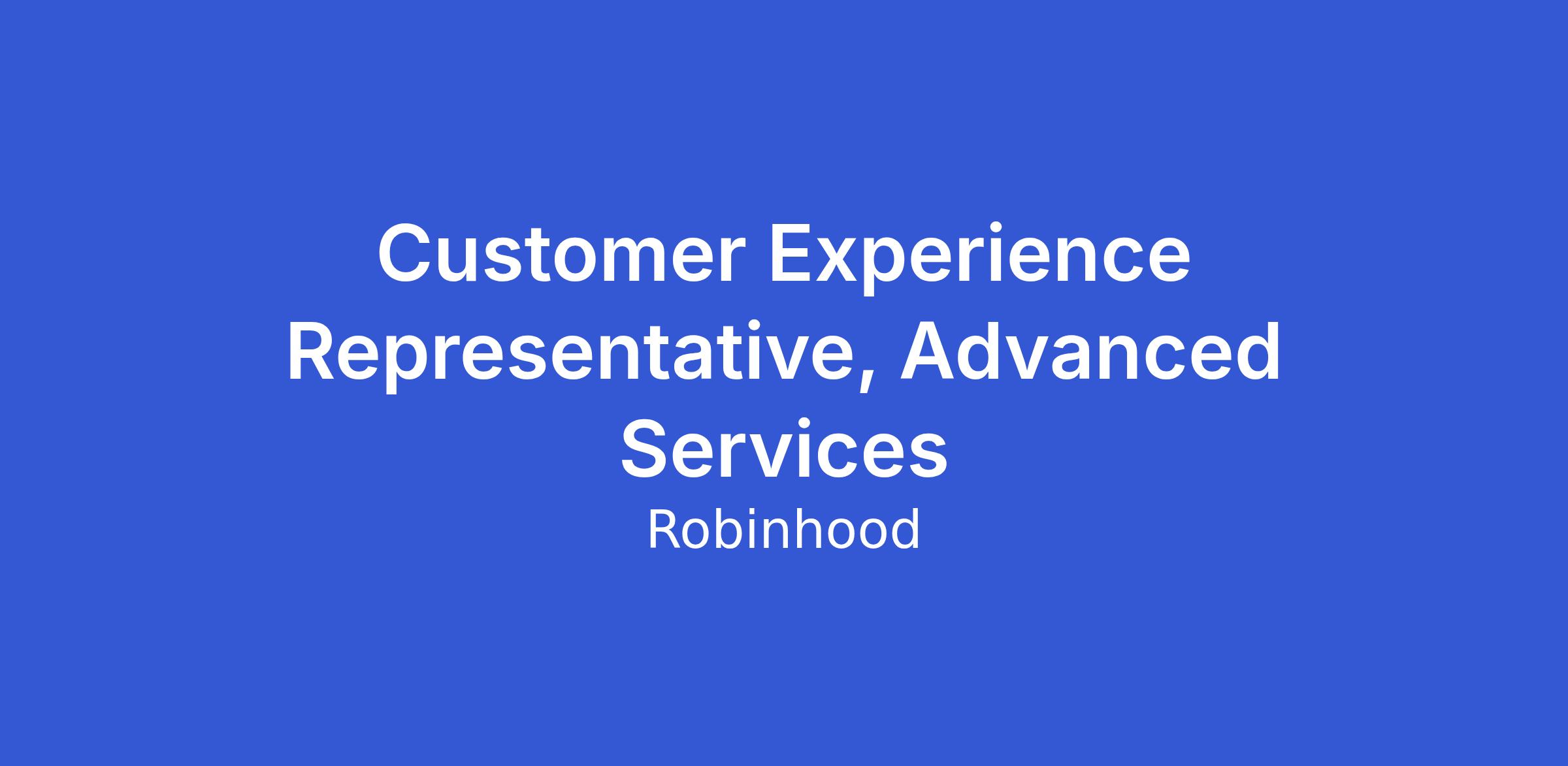 Robinhood's Customer Experience team is committed to providing an outstanding customer experience. In your role as an Advanced Services Representative, you will be empowered to help our customers with some of their most complex issues. In particular, your work will focus primarily on options trading and margin related issues experienced by our fast-growing customers. Your job is not only to help our customers with the issues they encounter, but empower them to learn and grow as traders. You will also play a critical role in providing feedback to business partners that help further enhance our product and platform, improving the customer experience.