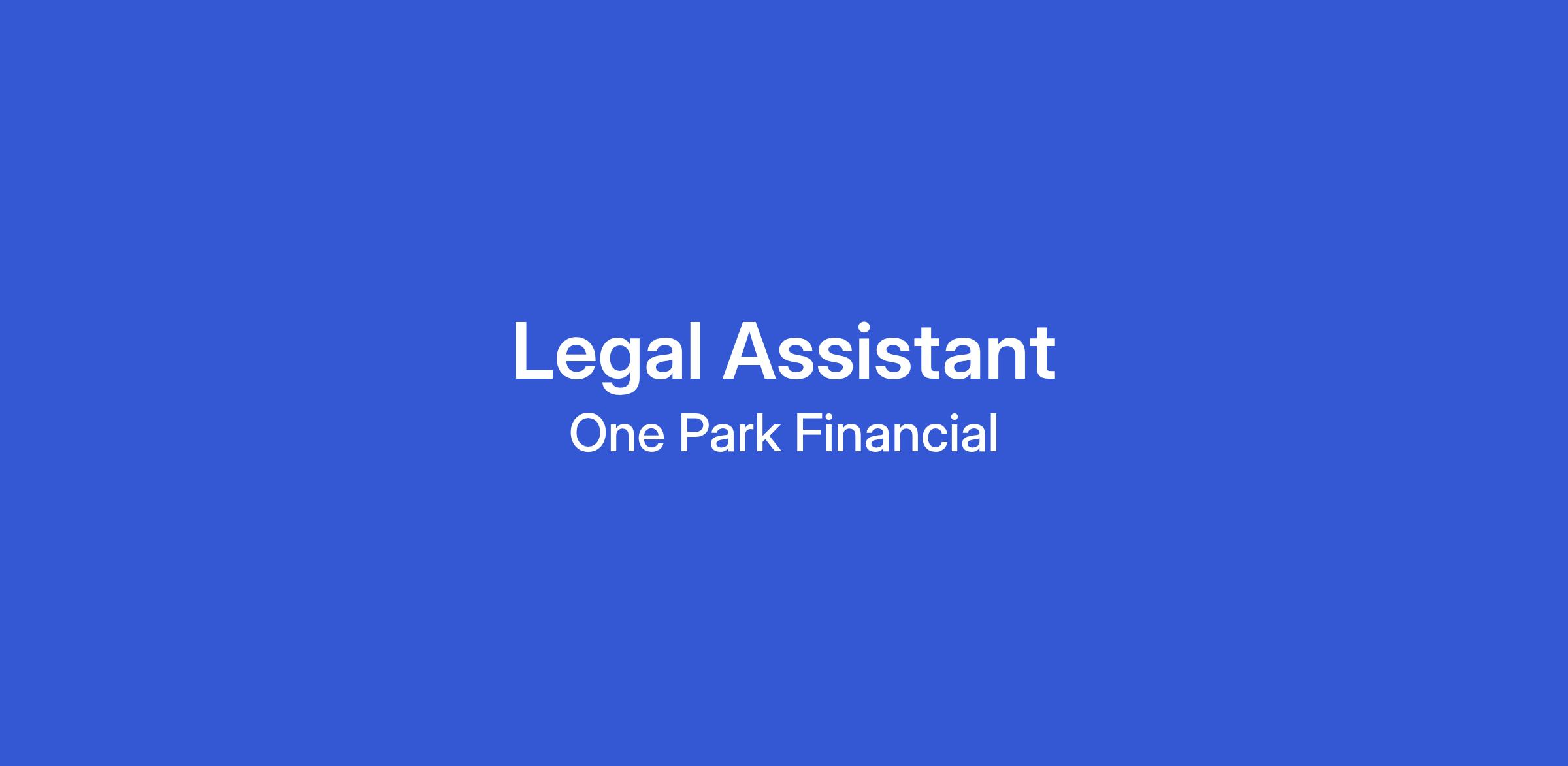 One Park Financial seeks a successful, energetic, and goal-oriented Legal Assistant to join its growing team. The Legal Assistant will make a difference at One Park Financial by helping to fully leverage the skills and talents of all our people. You will help our local offices drive the One Park Financial legal team strategies, and review and proofread documents and correspondence to ensure compliance with legal procedures and grammatical usage.