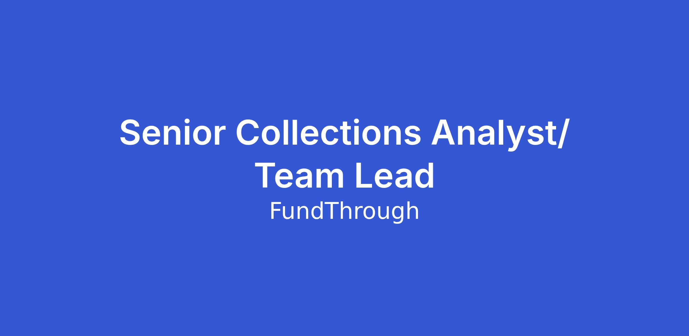 FundThrough is looking for a curious, passionate, and experienced Senior Collections Analyst / Team Lead to report to the Director, Global Collections & Cash Apps, and join us on our mission to help business owners improve their cash flow by getting them paid ahead of long net terms.