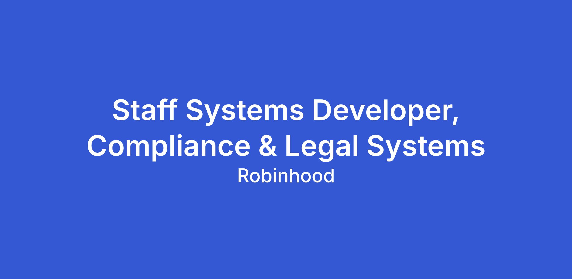 The Compliance and Legal Systems team’s mission is to leverage technology to ensure Robinhood complies with all applicable laws and regulations while protecting the firm. We focus on improving the effectiveness and efficiency of Compliance and Legal teams through scalable systems, improved workflows, automation, and strong controls.