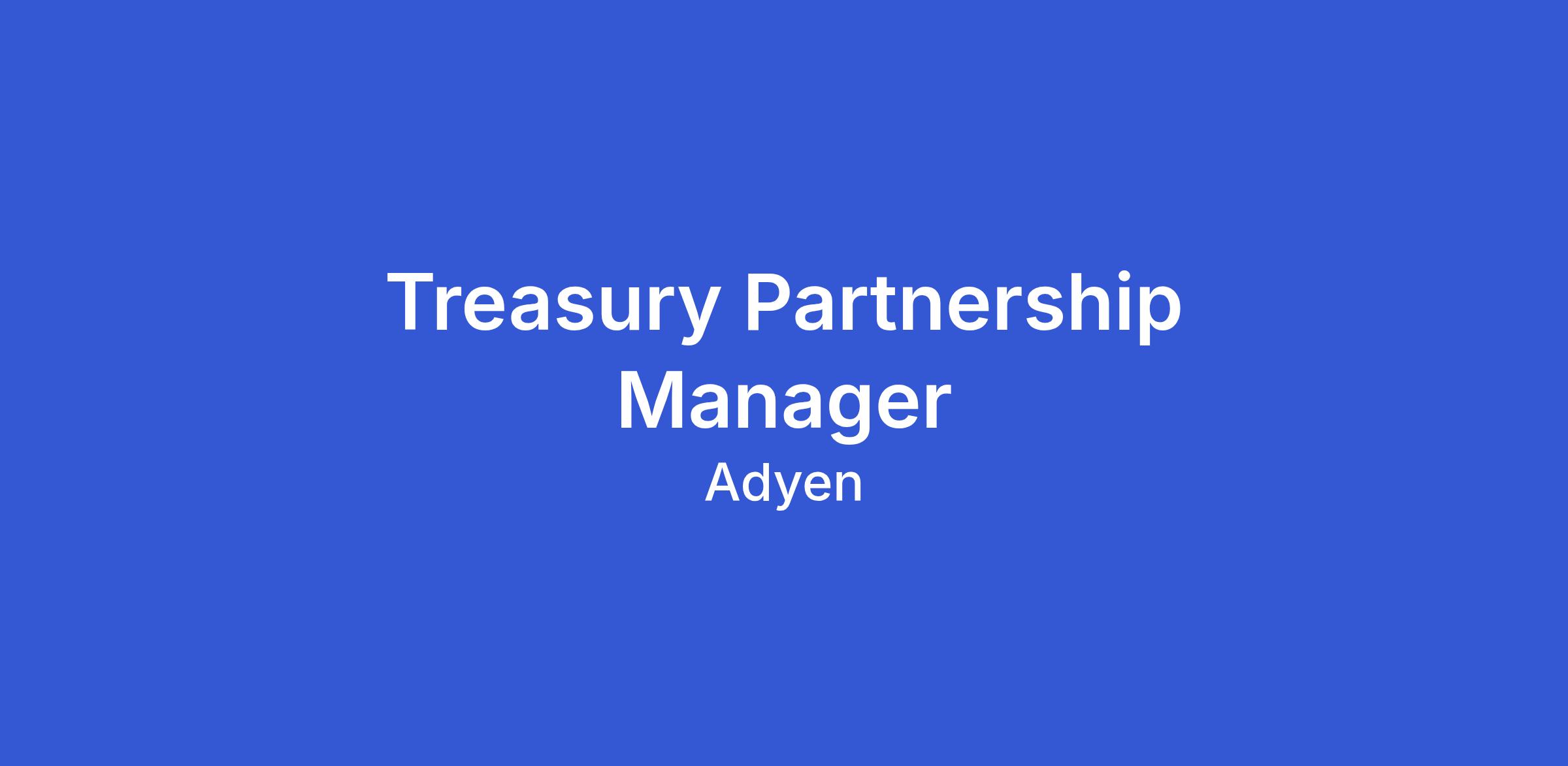 As a Treasury Partnerships Manager, you will take strategic ownership of our banking partnerships across one of core regions, either the Americas or EMEA. As a senior expert, you will act as a sparring partner in resolving complex global banking challenges with both commercial and central banks. Adyen Treasury is dedicated to offer a world-class payments experience to our merchants. By building a transparent, high-performing network of banking partners, you directly enable Adyen’s global strategy. The role is a fulltime position, based in Amsterdam.
